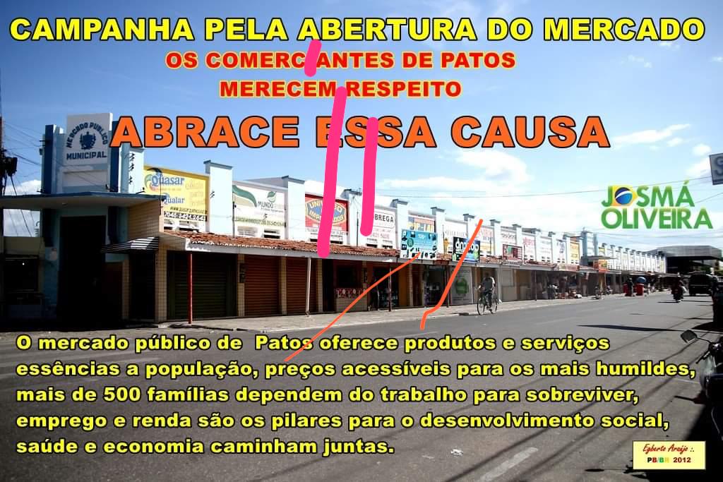 “O mercado público de Patos oferece produtos e serviços essenciais à população, preços acessíveis para os mais humildes, mais de 500 pessoas dependem do trabalho para sobreviver, emprego e renda são os pilares para o desenvolvimento social. Saúde e economia caminham juntas”, diz o banner que está sendo compartilhado nas redes sociais.