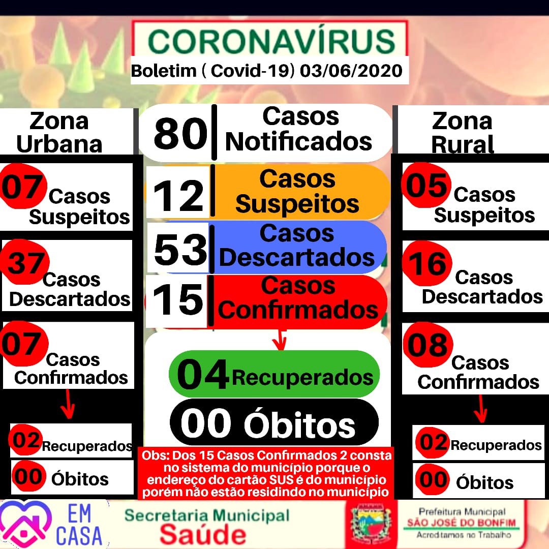 Nesta quarta-feira, 03 de junho, a Secretaria Municipal de Saúde divulgou um novo boletim epidemiológico informando os números do coronavírus em São José do Bonfim, Região Metropolitana de Patos.