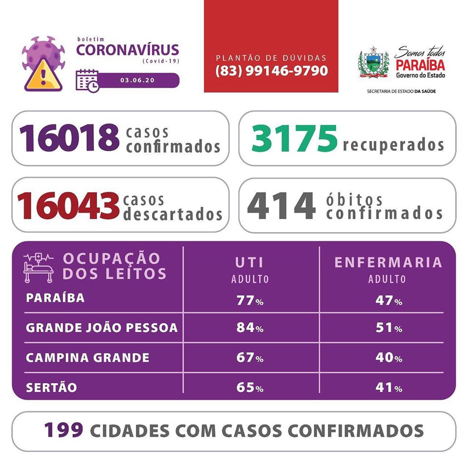 Nesta quarta, 03 de junho, a Paraíba registra 1.159 novos casos de Covid-19 e 35 óbitos confirmados desde a última atualização. São 16.018 paraibanos que já contraíram a doença, 3.175 pessoas que já se recuperaram e 414, infelizmente, faleceram. Importante destacar que a Secretaria de Estado da Saúde da Paraíba consolida os números aqui divulgados através dos sistemas oficiais de notificação (fonte e-sus VE e SIVEP), os quais têm fluxo de alimentação e exportação de acordo com cada serviço de saúde e/ou coordenação de vigilância. Dessa forma, alguns dos óbitos hoje divulgados não foram informados e só identificados após análise dos sistemas de informação.