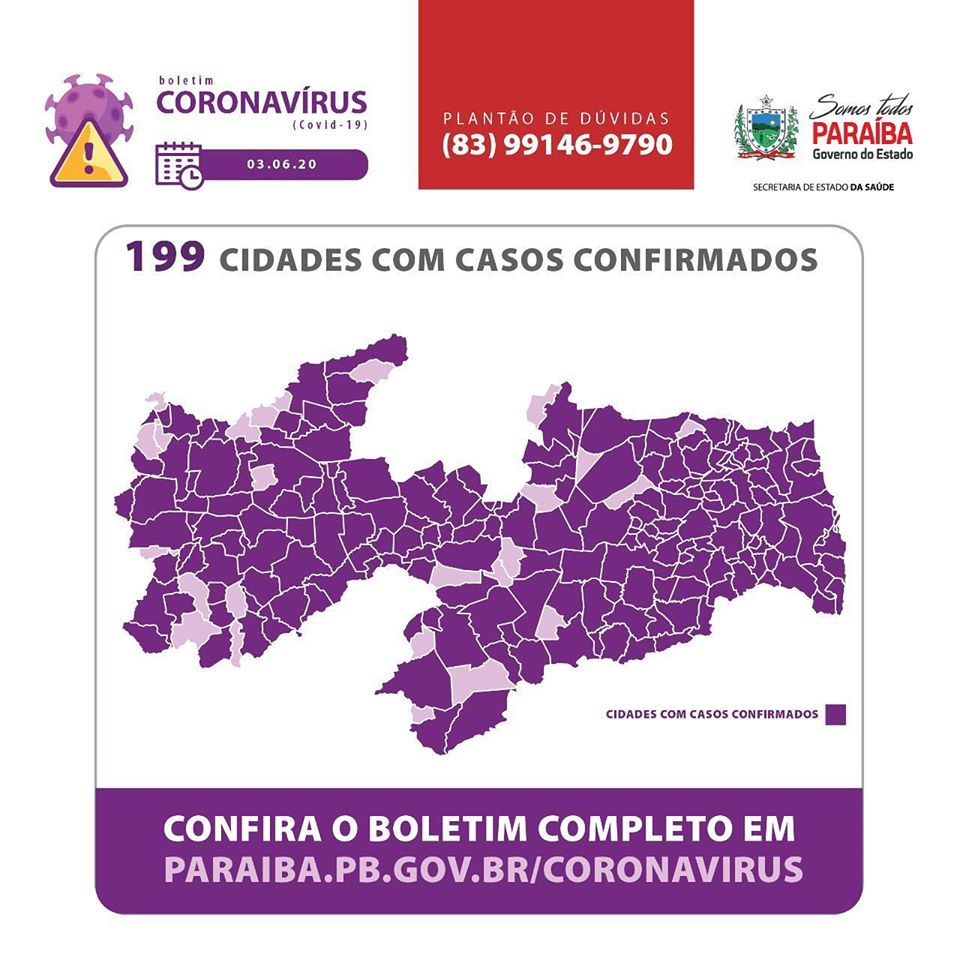 * A quantidade de casos confirmados em Patos divulgado pela SES permanece desatualizada. A Secretaria Municipal de Saúde divulgou um novo boletim nesta quarta-feira, 03/06, informando que o município tem 719 casos.