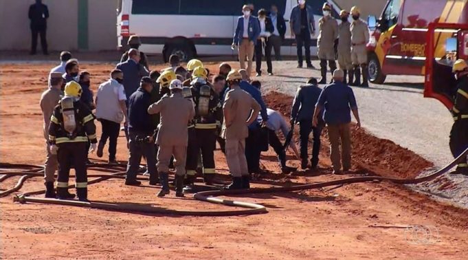 O presidente Jair Bolsonaro (sem partido) participou da inauguração do Hospital de Campanha de Águas Lindas de Goiás, no Entorno do Distrito Federal, nesta sexta-feira (5). Ele não usava máscara e, ao se dirigir ao local da cerimônia, escorregou e caiu.