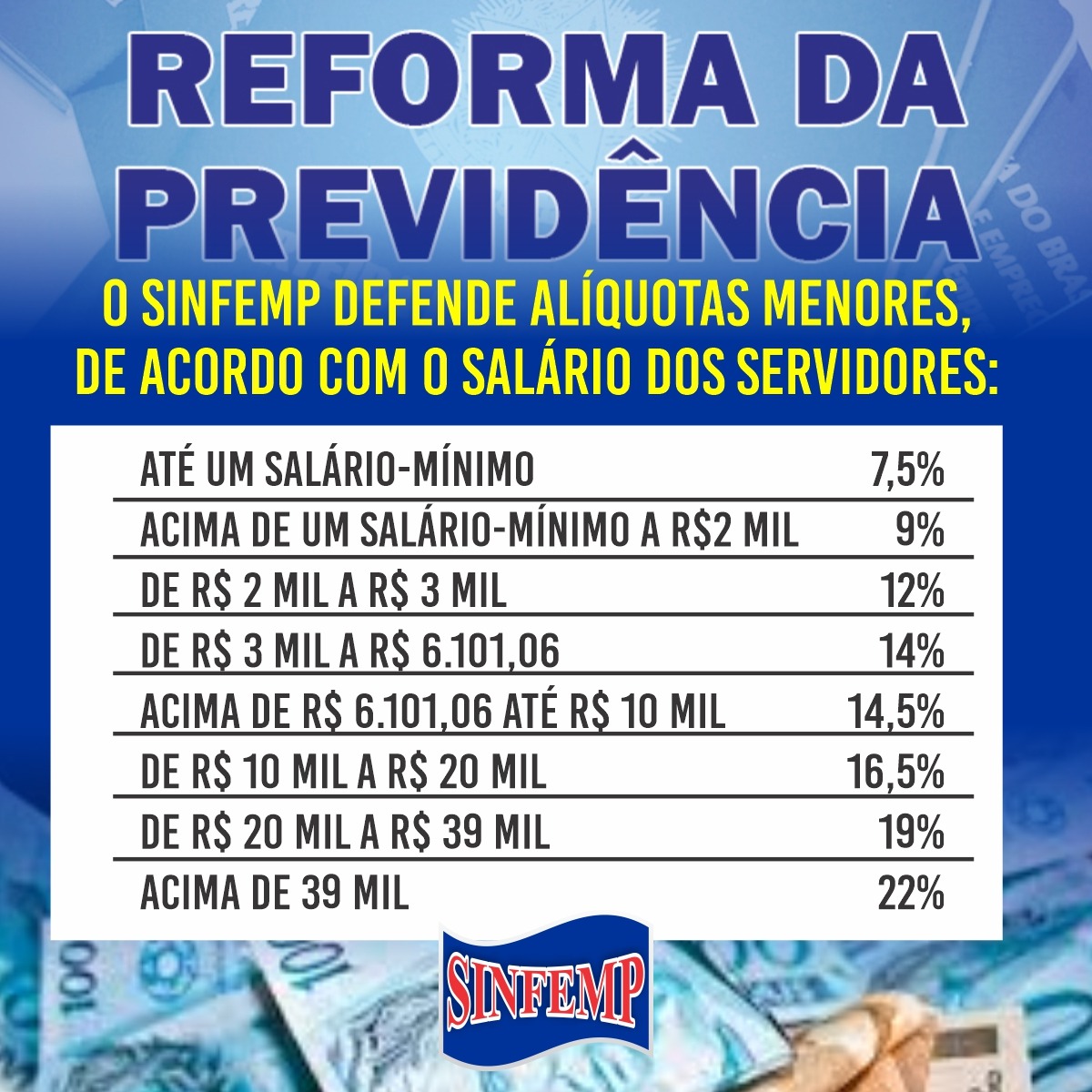 Carminha Soares ressaltou que o SINFEMP vai fazer a luta para que seja levado em consideração a tabela abaixo, iniciando a cobrança de 7,5% para quem ganha até R$ 1.045,00. Acima de R$ 1.045,00 até R$ 2.000,00, 9%. Acima de R$ 2.000,00 a R$ 3.000,00 seja cobrado,12%. Acima de R$ 3.000,00 a R$ 6.101,06 seja cobrado 14%. De R$ 6.101,06 a R$ 10.000,00 seja cobrado o percentual de 14,5%. De R$ 10.000,00 a R$ 20.000,00 seja cobrado 16,5%. Acima de R$ 20.000,00 a R$ 39.000,00 seja cobrado 19%. Acima de R$ 39.000,00, seja cobrado 22%.