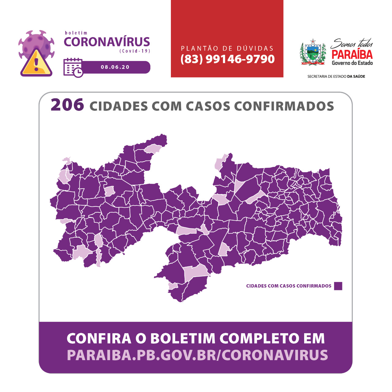 * O número de casos confirmados em Patos divulgado pela SES está desatualizado. Nesta segunda-feira, 08/06, a Secretaria Municipal emitiu um novo boletim epidemiológico informando que o município tem 859 casos.