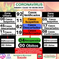 Atualmente, o município tem 19 casos confirmados, 11 casos suspeitos, 4 casos recuperados e nenhum óbito.