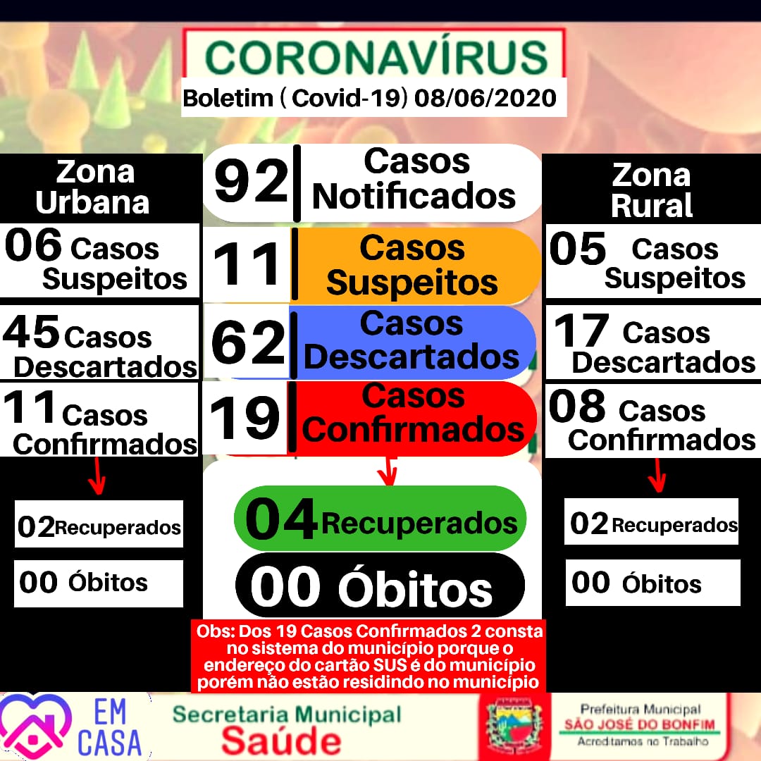 Na tarde desta segunda-feira, 08 de junho, a Secretaria Municipal de Saúde divulgou um novo boletim epidemiológico informando os números do coronavírus em São José do Bonfim, Região Metropolitana de Patos.