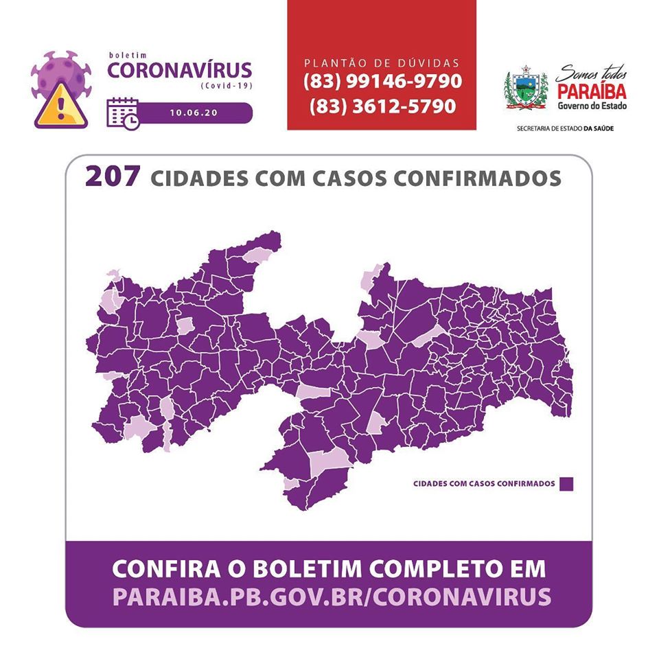 Os casos confirmados estão distribuídos por 207 dos 223 municípios paraibanos: