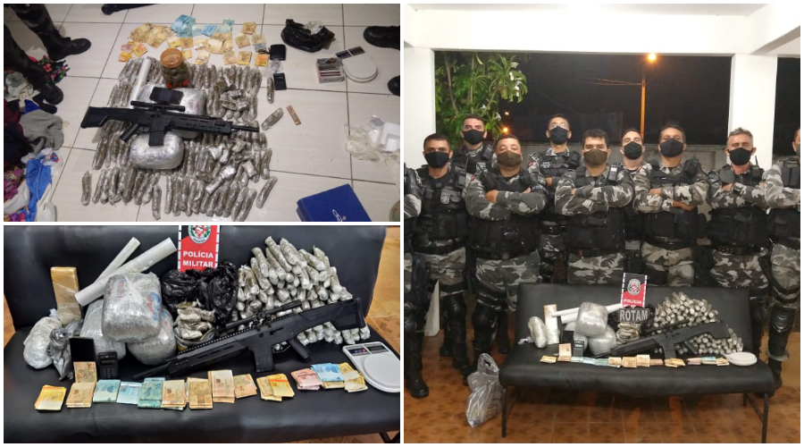No local, os militares encontraram pacotes de substâncias análoga à maconha, prontos para a venda (127 embrulhos) e outros 3 quilos para embalar, somando 7,437 quilos da droga; balança de precisão; cerca de R$ 16.869,00 em dinheiro; maquineta de cartão; celulares e uma réplica de fuzil estilo Airsoft.