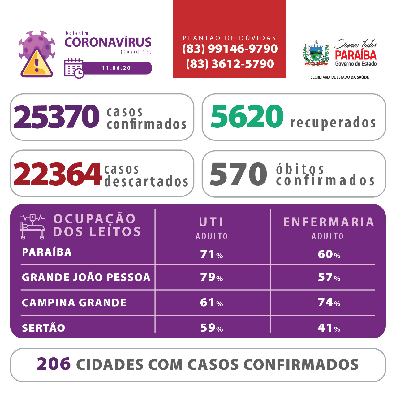 Nesta quinta, 11 de junho, a Paraíba registrou 1.338 novos casos de Covid-19 e 11 óbitos confirmados desde a última atualização, 5 deles ocorridos nas últimas 24h. São 25.370 pessoas que já contraíram a doença, 5.620 que já se recuperaram e 570 faleceram. 73.776 testes para diagnóstico da da Covid-19 já foram realizados entre testes rápidos e PCR.