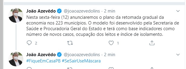 O Governo do Estado manteve diálogo com vários segmentos sociais, de trabalhadores, religiosos e o setor produtivo de um modo geral, consolidando um documento único e norteador de como poderá retomar as atividades, considerando o risco para a população, uma vez que o vírus apresenta alta transmissibilidade. Nesta quarta-feira (10), a Paraíba tem 24.032 casos confirmados e 559 óbitos causados pela Covid-19. A taxa de ocupação de leitos é de 69% e mantém a média de 40% de índice de isolamento social.