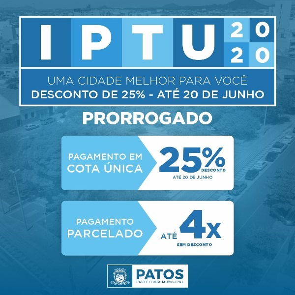 O Diretor da Administração Tributária, Mirellio Almeida, informou que caso o contribuinte esteja com dificuldades no pagamento de seu IPTU, deverá solicitar reemissão do IPTU 2020 através do e-mail: iptu@patos.pb.gov.br ou WhatsApp 83 998007584 com foto do IPTU (legível) e CPF do proprietário para solução do problema.