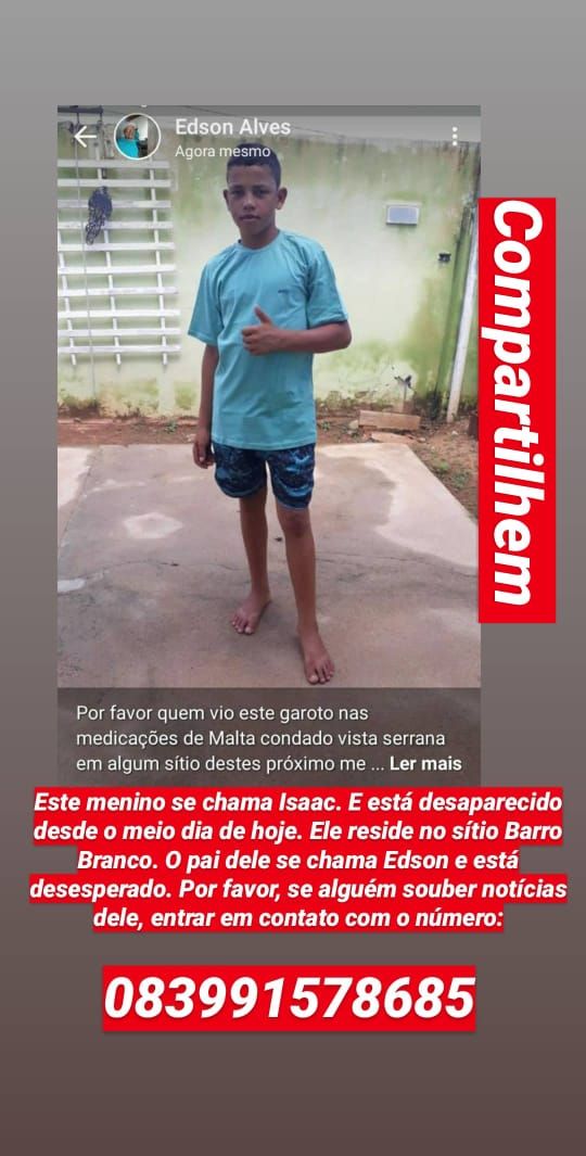 A criança Isaac, de 13 anos de idade, que reside no Sítio Barro Branco, que fica entre os municípios de Condado e Malta, na Região Metropolitana de Patos, está desaparecida desde 12h deste sábado (13). A família dele usou as redes sociais para pedir ajuda as pessoas para poder encontrá-lo.