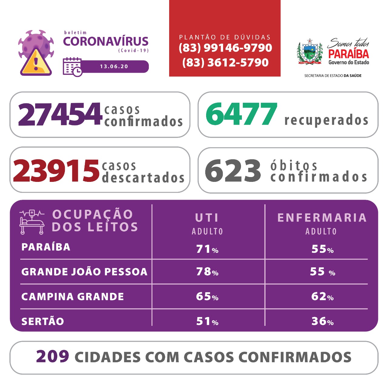 Neste sábado, 13 de junho, a Paraíba registrou 898 novos casos de Covid-19 e 13 óbitos confirmados desde a última atualização, 4 deles ocorridos nas últimas 24h. São 27.454 pessoas que já contraíram a doença, 6.477 que já se recuperaram e 623 faleceram. 82.998 testes para diagnóstico da da Covid-19 já foram realizados entre testes rápidos e PCR.