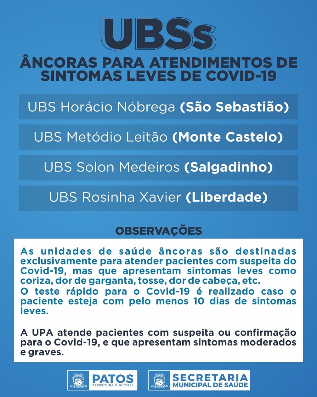 Dentre as medidas que a Prefeitura de Patos está intensificando para combater e controlar a proliferação do coronavírus estão as unidades de saúde âncoras que foram destinadas exclusivamente para atender pacientes com suspeita do Covid-19, mas que apresentam sintomas leves como coriza, dor de garganta, tosse, dor de cabeça, etc.