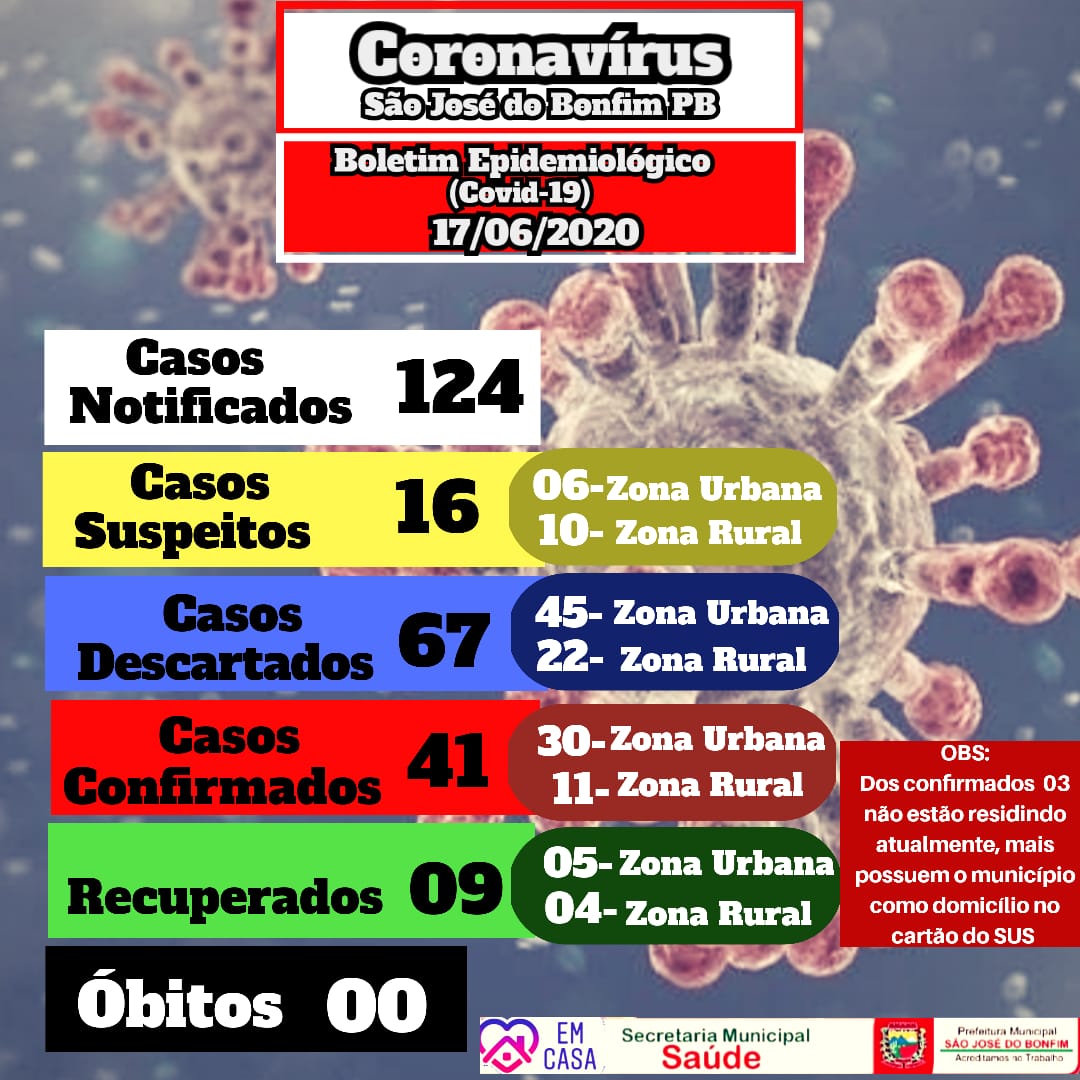 Nesta quarta-feira, 17, a Secretaria Municipal de Saúde emitiu um novo boletim epidemiológico informando os números do coronavírus em São José do Bonfim, Região Metropolitana de Patos.