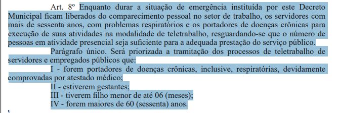 No âmbito do serviço público, o documento, em seu art. 8°, decreta que enquanto durar a pandemia, os servidores com mais de 60 anos ficam liberados de comparecer ao setor de trabalho, além de servidores com problemas respiratórios e os portadores de doenças crônicas para execução de suas atividades na modalidade de teletrabalho, resguardando-se que o número de pessoas em atividade presencial seja suficiente para a adequada prestação do serviço público.