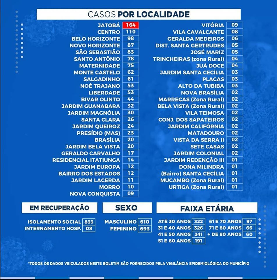 Nas últimas 24h foram registrados 58 novos casos de coronavírus, e os bairros com o maior número de registros foram o Novo Horizonte, 7 casos a mais, já o Jatobá e o Belo Horizonte tiveram 6 casos a mais cada um.