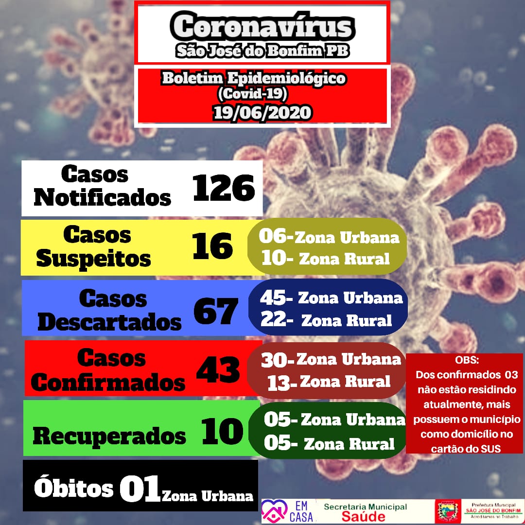 Nesta sexta-feira, 19, a Secretaria Municipal de Saúde emitiu um novo boletim epidemiológico informando os números do coronavírus em São José do Bonfim, Região Metropolitana de Patos.