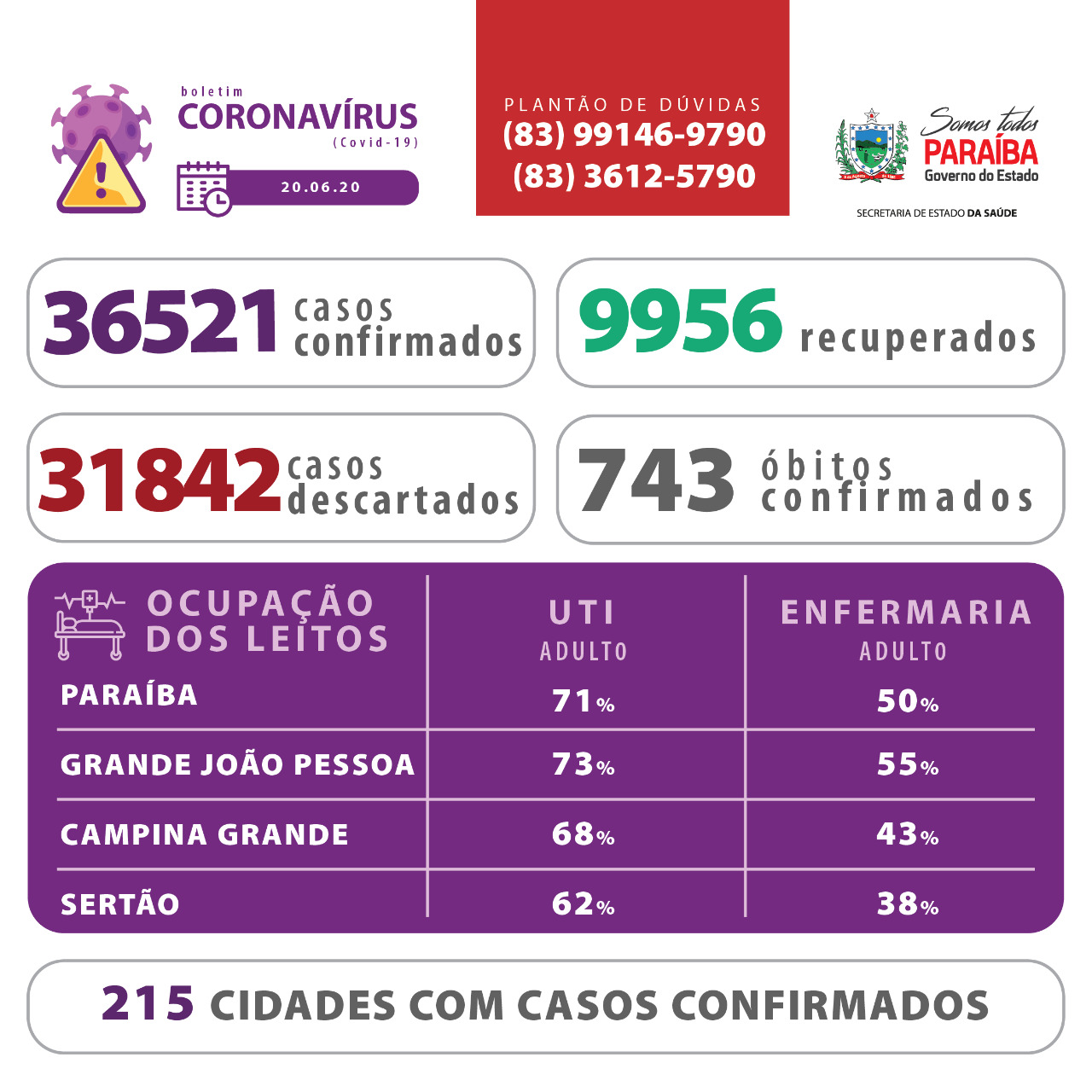 Os dados epidemiológicos e de ocupação de leitos estão disponíveis em www.paraiba.pb.gov.br/coronavirus