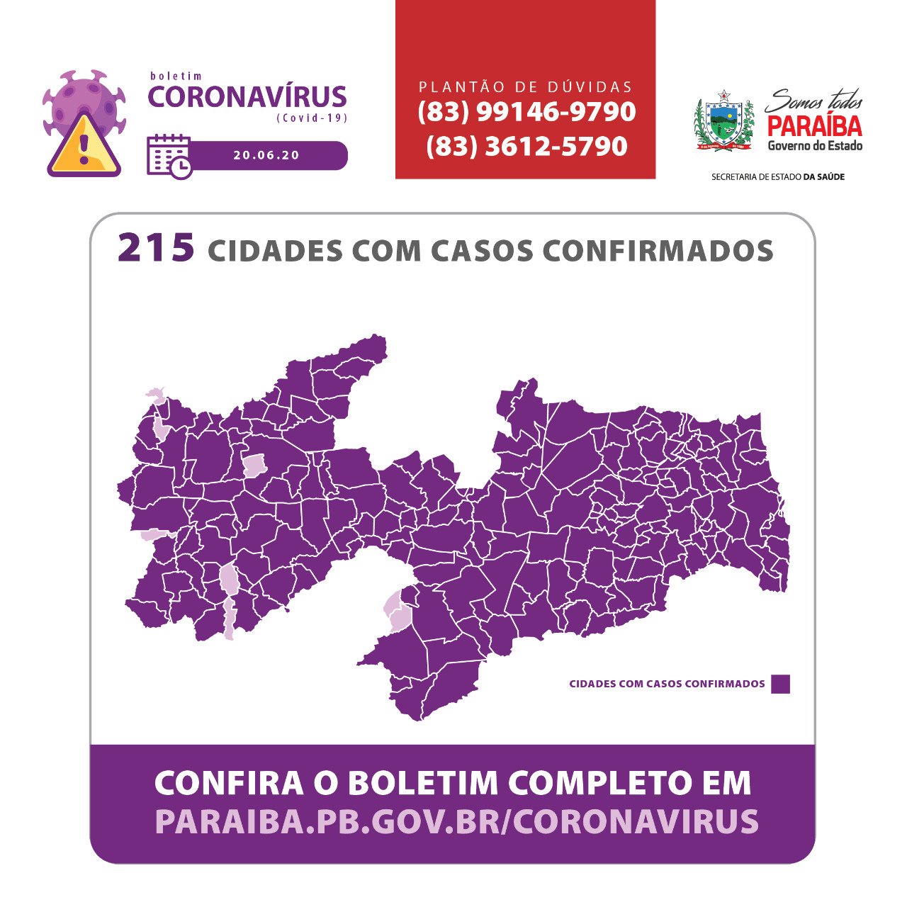 * O número de casos confirmados em Patos divulgado pela SES está desatualizado. A Secretaria Municipal de Saúde emitiu um novo boletim epidemiológico nesta última sexta-feira, 19, informando que o município tem 1.303 casos. A pasta municipal divulgará uma nova atualização na próxima segunda-feira, 22.