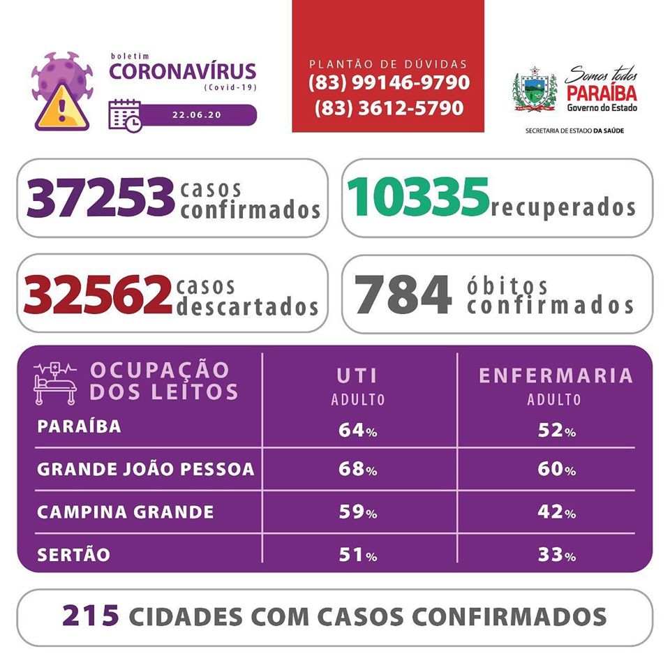 Os dados epidemiológicos e de ocupação de leitos estão disponíveis em www.paraiba.pb.gov.br/coronavirus