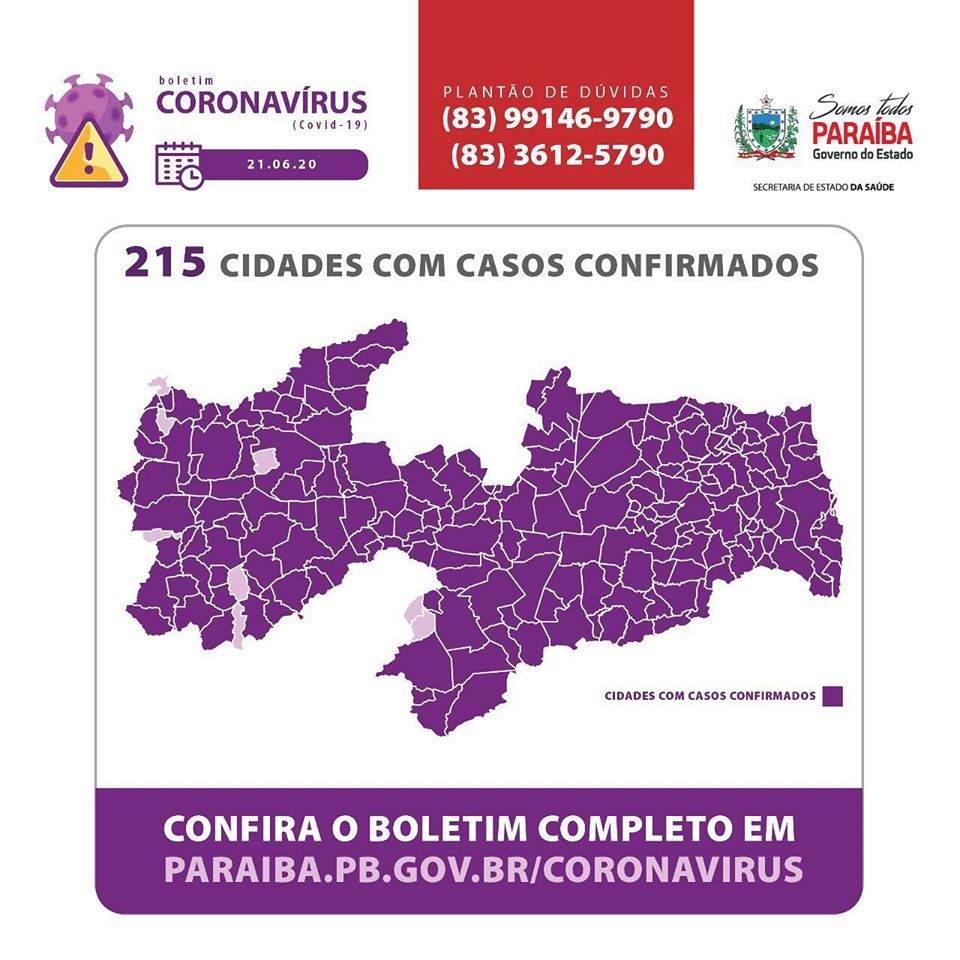 Os casos confirmados estão distribuídos por 215 dos 223 municípios paraibanos: