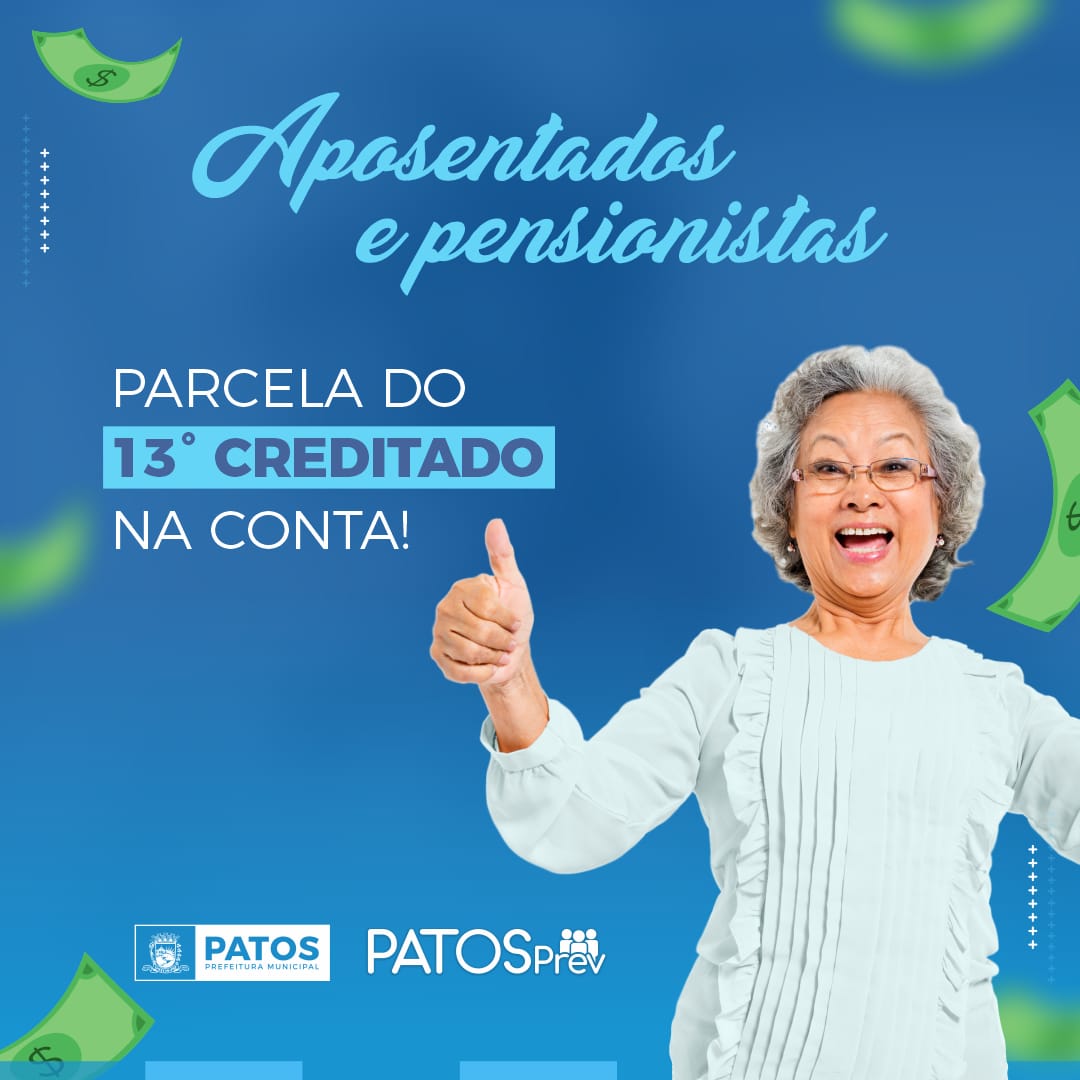 A Prefeitura de Patos e o Patos Prev confirmam nesta terça-feira, dia 23 de junho, o pagamento da primeira parcela do décimo terceiro salário dos servidores aposentados e pensionistas.