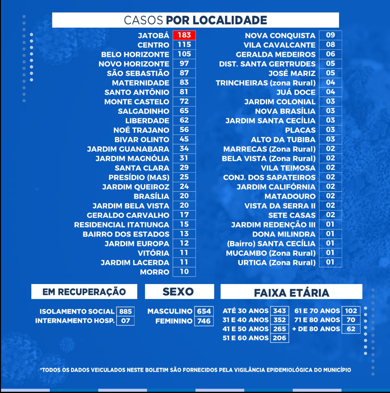 Todos os dados veiculados tanto no boletim quanto no relatório, são fornecidos pela Vigilância Epidemiológica do Município.