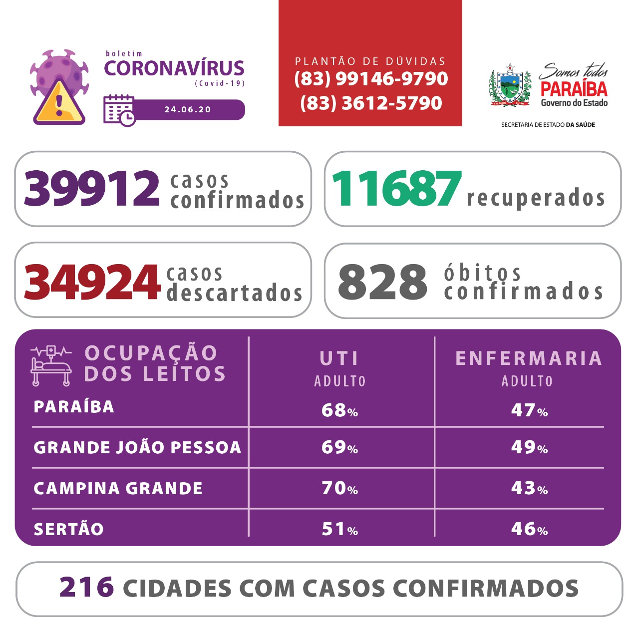 Os dados epidemiológicos e de ocupação de leitos estão disponíveis em www.paraiba.pb.gov.br/coronavirus