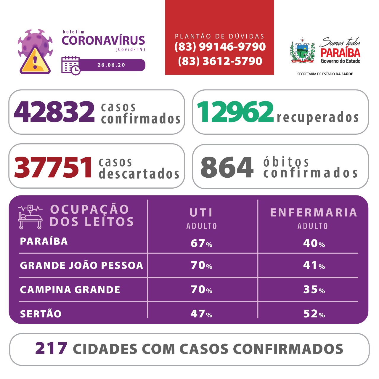 Os dados epidemiológicos e de ocupação de leitos estão disponíveis em www.paraiba.pb.gov.br/coronavirus