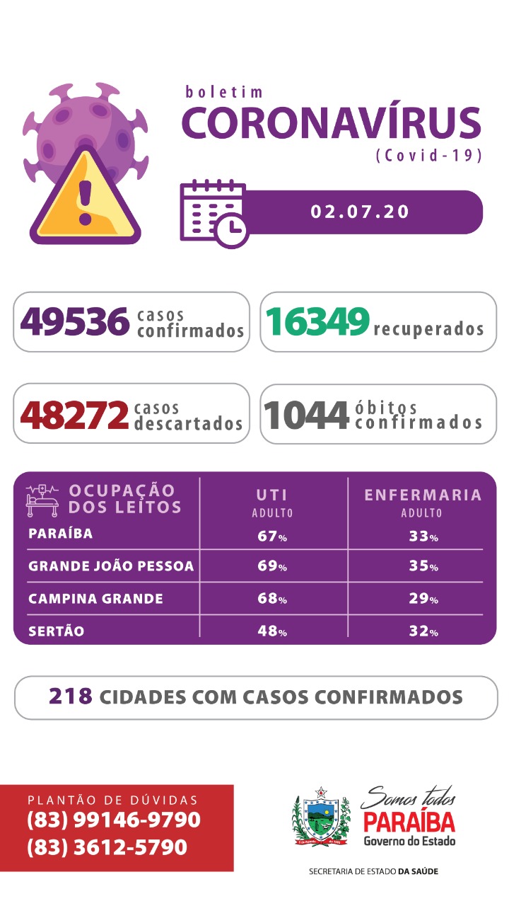 Nesta quinta, 02 de julho, a Paraíba registrou 1.362 novos casos de Covid-19 e 42 óbitos confirmados desde a última atualização, 09 deles ocorridos nas últimas 24h. São 49.536 pessoas que já contraíram a doença, 16.349 que já se recuperaram e 1.044 faleceram. Até o momento, 139.880 testes para diagnóstico da Covid-19 já foram realizados.