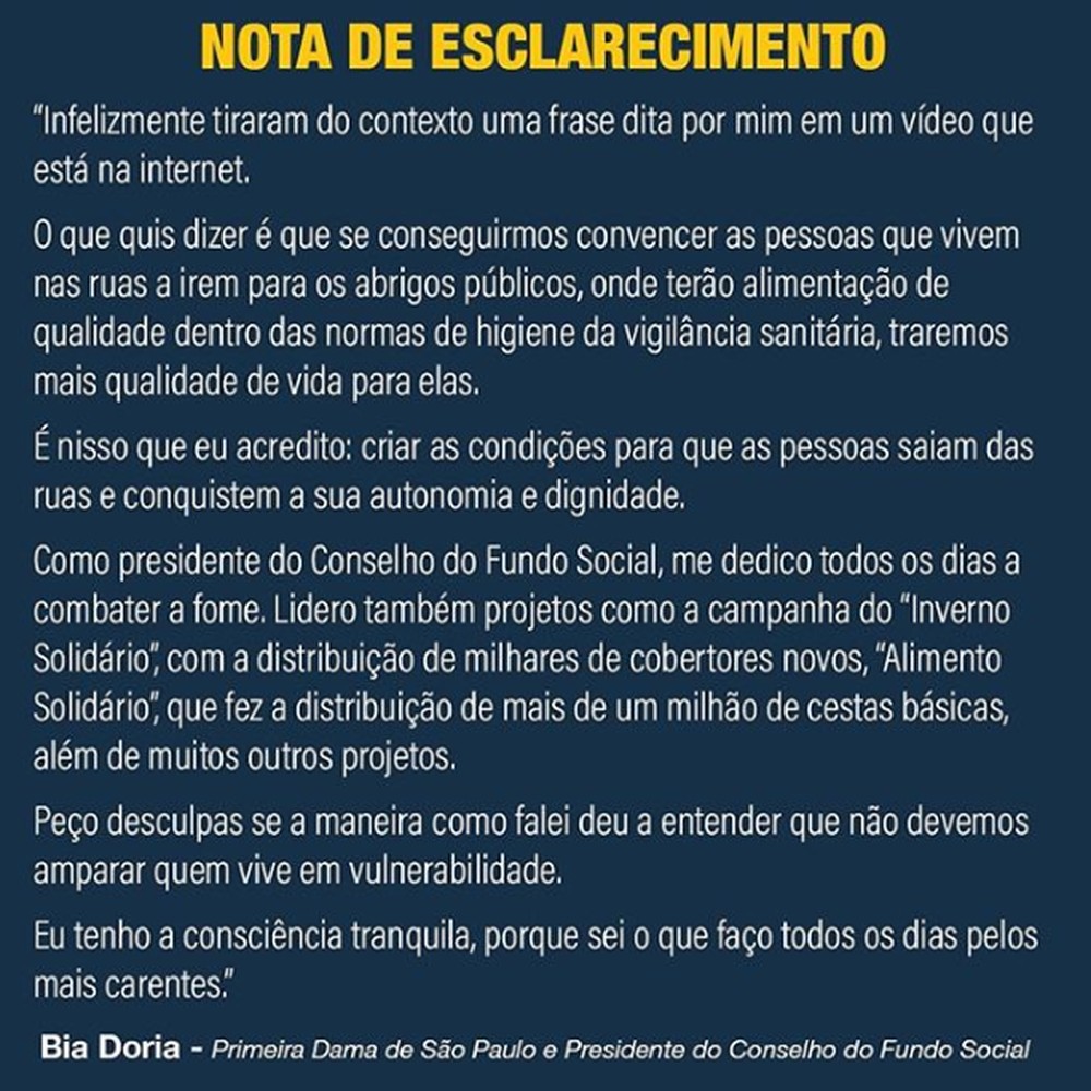 “Em relação aos comentários sobre pessoas em situação de rua, a presidente do Conselho do Fundo Social de São Paulo, Bia Doria, esclarece que sua fala foi tirada do contexto e enfatiza que a sua intenção é que as pessoas em situação de rua tenham acesso aos abrigos públicos, onde terão alimentação de qualidade dentro das normas de higiene da Vigilância Sanitária, e uma condição de vida mais digna. Ou mesmo nos Restaurantes Bom Prato, que recentemente decretaram gratuidade aos moradores de rua.