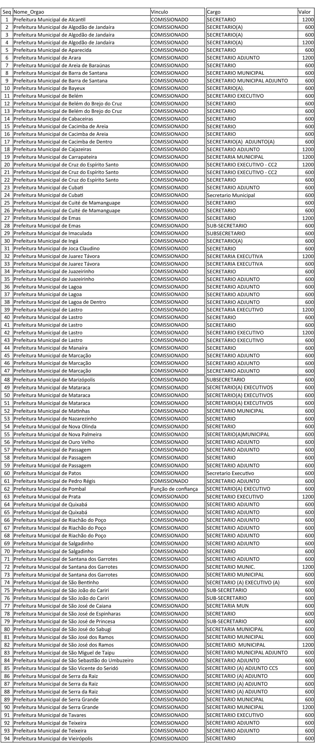 Um levantamento realizado pela Controladoria Geral da União (CGU) na Paraíba identificou que 94 secretários municipais da Paraíba receberam auxílio emergencial do Governo Federal. Alguns receberam o valor de R$ 600, enquanto outros obtiveram o benefício de R$ 1.200 destinado a chefes de família.