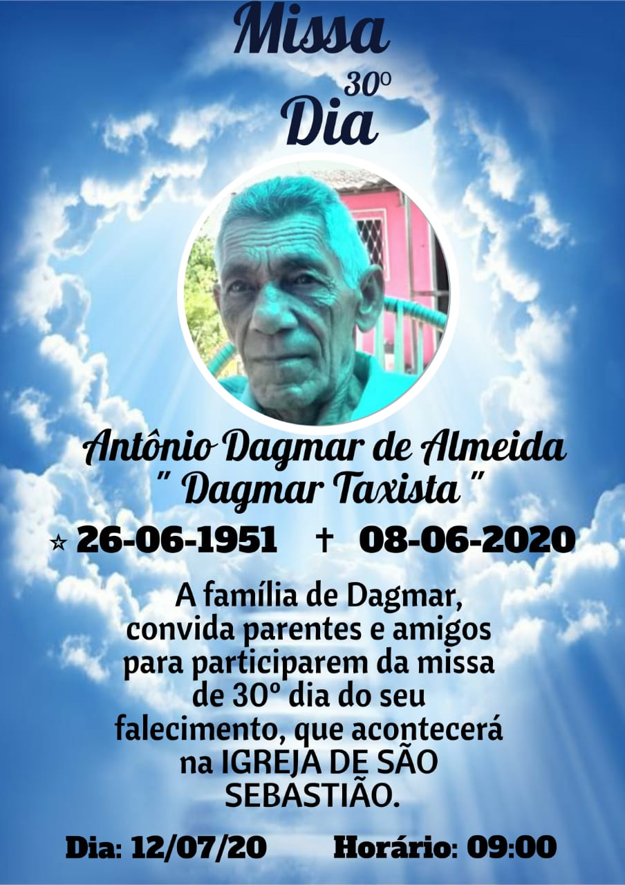 A família de Antônio Dagmar de Almeida (Dagmar Taxista) convida amigos e parentes para a celebração da missa de trigésimo dia que acontece às 9 deste domingo, 12/07, na Paróquia São Sebastião, em Patos.