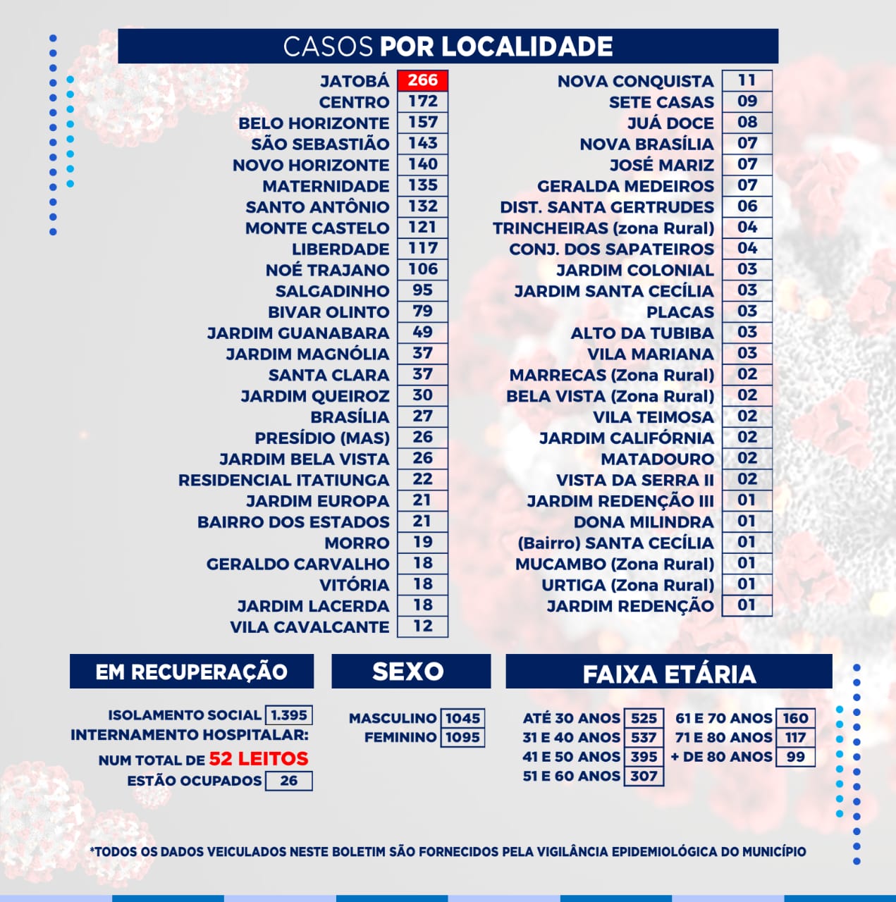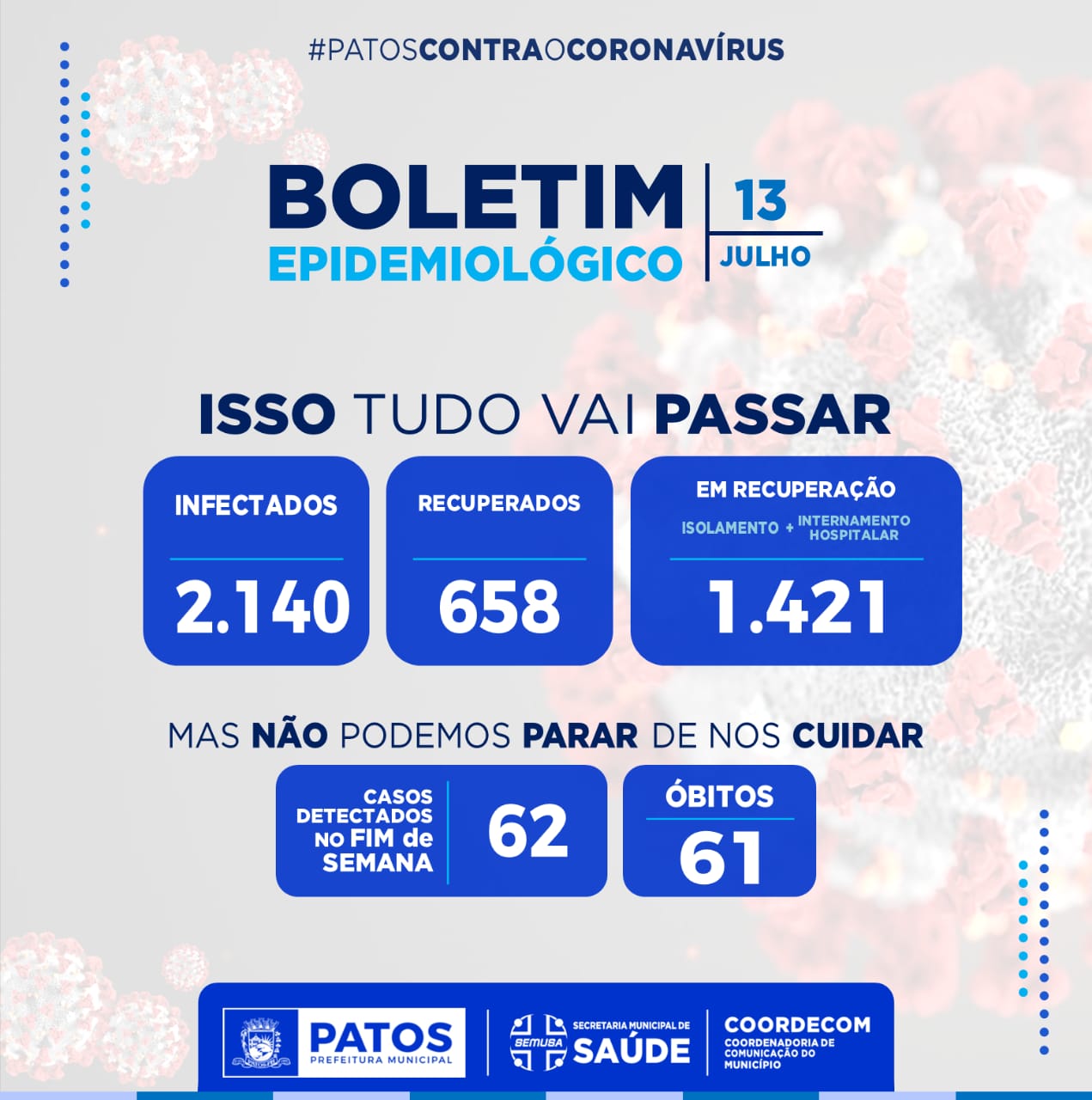 De acordo com o acompanhamento da Vigilância Epidemiológica, dos 52 leitos, disponíveis na rede pública hospitalar, tem 26 pessoas internadas com suspeita ou confirmação da Covid-19. Até esta segunda, Patos registra 2.140 casos confirmados do coronavírus.