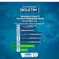 Após anteriormente ter zerado os casos e passado quase um mês assim, a cidade de Ipueira-RN tinha notificado mais dois novos pacientes infectados recentemente, mas nesta quarta-feira, 15/07,o novo boletim anunciou a recuperação e a boa notícia de que a cidade voltou a zerar os casos de Covid-19.