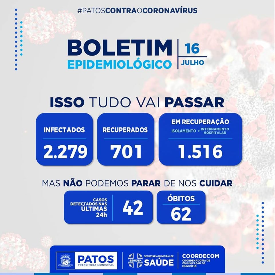A Capital do Sertão paraibano até esta quinta-feira, 16/07, contabilizou 2.279 casos do novo coronavírus (Covid-19). Desses números, 1.516 estão em recuperação, 701 estão recuperados e 62 óbitos.