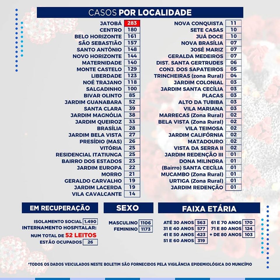 Nas últimas 24h foram registrados 42 novos casos de coronavírus, e as localidades com o maior número de registros foram: Jatobá e Santo Antônio, com 7 casos a mais cada um; e Monte Castelo, Noé Trajano e São Sebastião, com 5 casos a mais cada um. E das 53 localidades inseridas no boletim, 37 delas não registraram nenhum caso.