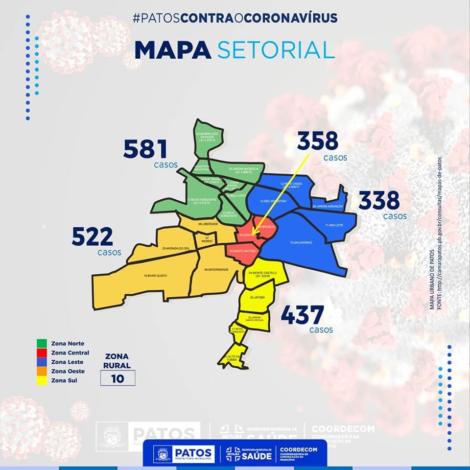 Ainda de acordo com os números desta quinta, a Zona Norte de Patos segue como a região com o maior índice de casos confirmados para o Covid-19, com 581 casos. Na separação por localidades, o Jatobá (bairro da Zona Sul) lidera com o registro de 283 casos.