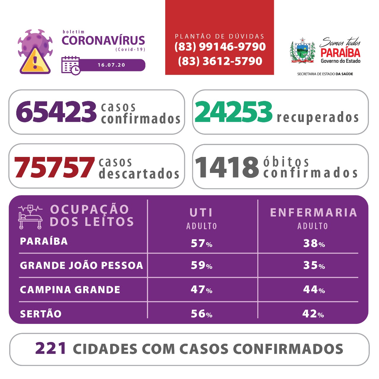 Nesta quinta, 16 de julho, a Paraíba registrou 1.484 novos casos de Covid-19 e 35 óbitos confirmados desde a última atualização, 8 deles ocorridos nas últimas 24h. São 65.423 pessoas que já contraíram a doença, 24.253 que já se recuperaram e 1.418 faleceram. Até o momento, 193.094 testes para diagnóstico da Covid-19 já foram realizados.