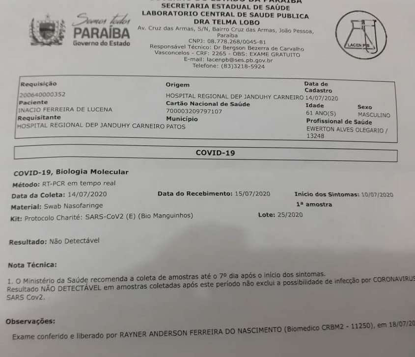 “Quero agradecer a todos os amigos do facebook, whatsapp, da imprensa, todos que ligaram… e todo o corpo de funcionários do Hospital de Patos e de maneira especial a Equipe do UTI Covid, no qual testemunhei o excelente trabalho e dedicação daqueles profissionais.