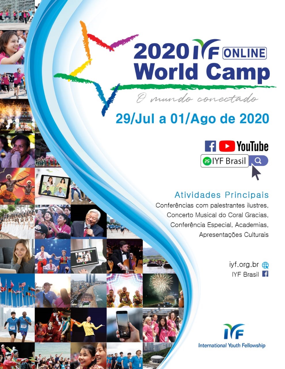 Do dia 29 a 1º de agosto, a IYF – International Youth Fellowship, realizará o World Camp 2020. A organização IYF, presente em 95 países, realiza anualmente o evento em diversos países, e este ano, em virtude da pandemia, realizará o evento on-line. A transmissão será via videoconferência através do aplicativo ZOOM, para 95 países e traduzido em sete idiomas: português, espanhol, francês, inglês, chinês, coreano e russo.