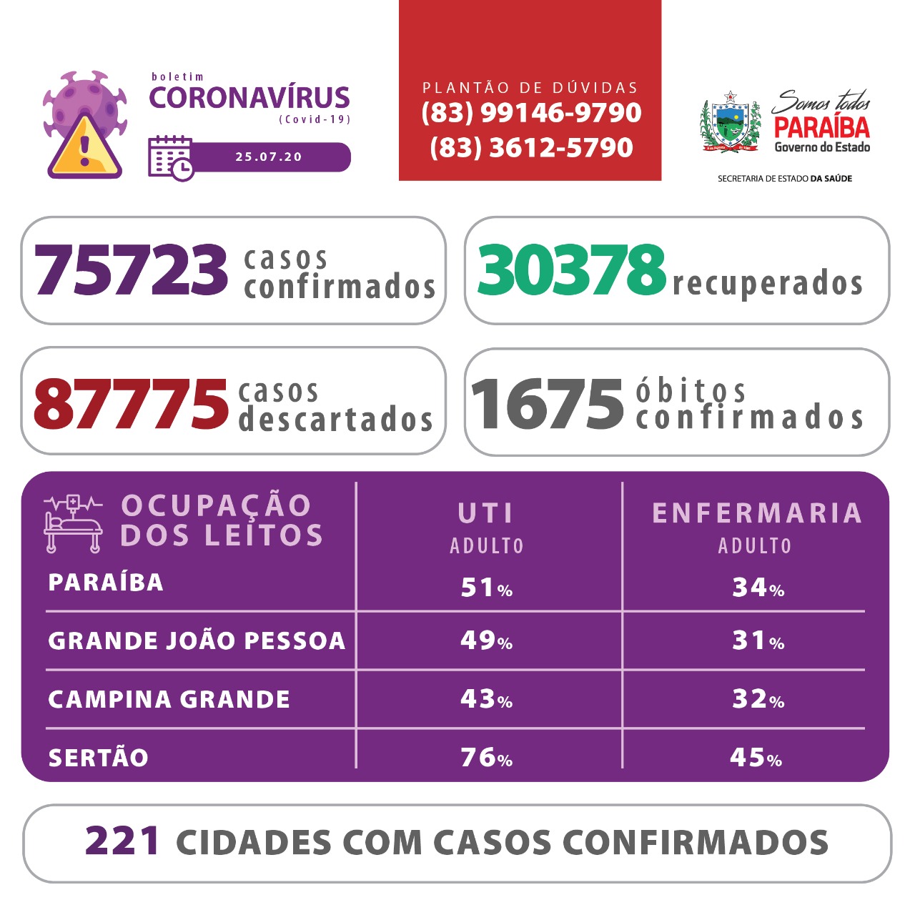Neste sábado, 25 de julho, a Paraíba registrou 1.173 novos casos de Covid-19 e 22 óbitos confirmados desde a última atualização, 7 deles ocorridos nas últimas 24h. Até o momento, 75.723 pessoas já contraíram a doença, 30.378 já se recuperaram e 1.675 faleceram. Até o momento, 222.370 testes para diagnóstico da Covid-19 já foram realizados.