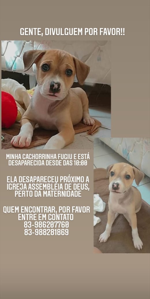 Uma mulher de nome Michelle procura sua cadela de apenas dois meses que desapareceu desde a manhã desta terça-feira, 28/07, na Rua Padre Anchieta, 1012, próximo à Igreja Assembleia de Deus, no bairro Santo Antônio, em Patos.