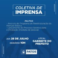 A Prefeitura de Patos convida a imprensa local para participar na manhã desta terça-feira (28) às 10h, no gabinete do prefeito, de uma entrevista coletiva onde será anunciado o Programa de Reestruturação da Atenção Básica para o Novo Normal.