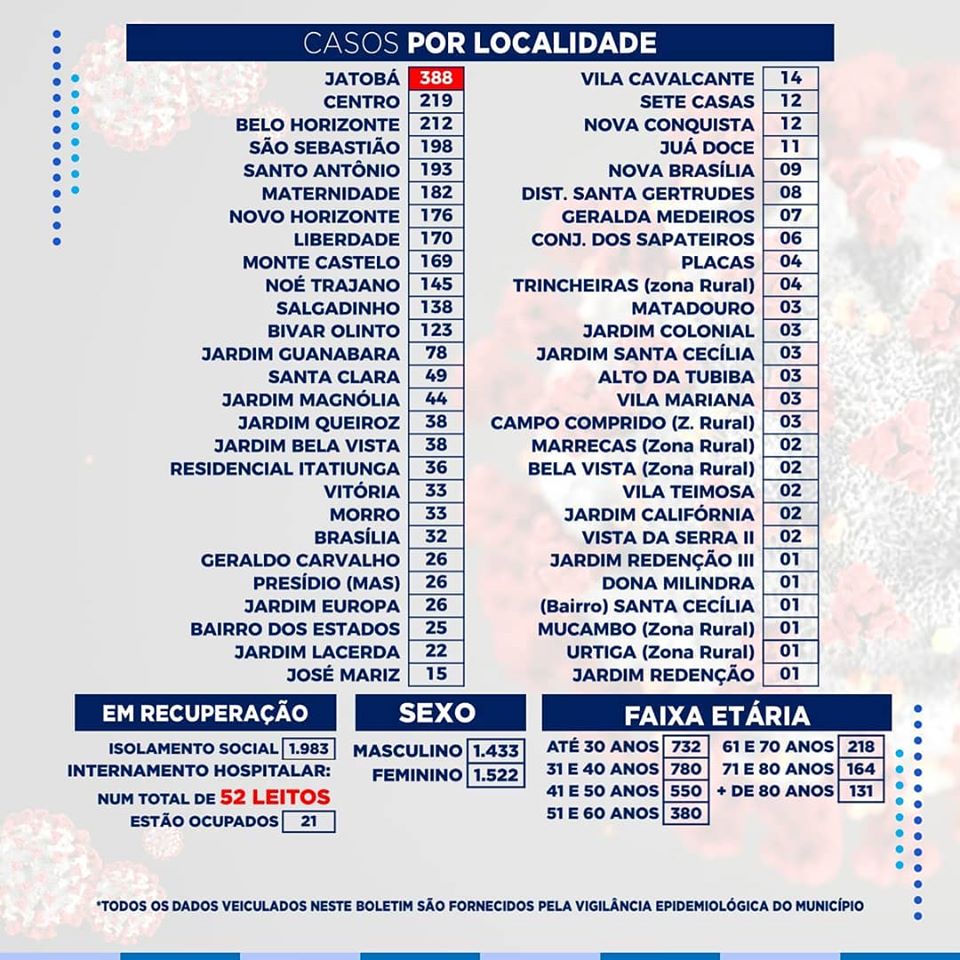 No levantamento feito dos leitos hospitalares, dos 52 disponíveis 21 estão ocupados, enquanto que 1.983 dos infectados cumprem recuperação em isolamento domiciliar. Dos casos registrados por gênero, o sexo feminino está na frente com 1.522 casos, e na faixa etária até 40 anos foram registrados 1.522 casos.