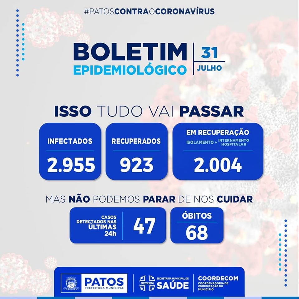 A Vigilância Epidemiológica da Secretaria de Saúde de Patos divulgou nesta sexta-feira, 31 de julho, o total de 2.955 casos de Covid-19. Desse total de infectados, 2.004 estão em recuperação, 923 estão recuperados e o registro de 67 óbitos, e 47 novos casos nas últimas 24h.