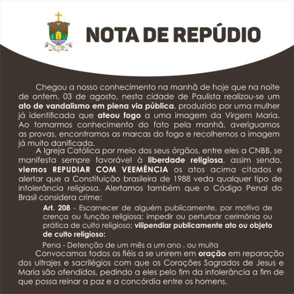 No fim da tarde dessa terça-fera (04), a Paróquia de São José, em Paulista, emitiu uma nota de repúdio com relação a ação praticada.