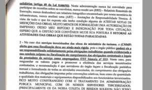 Paulo Marinho ainda relatou na carta que suas atribuições designadas pelo Ministério do Turismo não vêm sendo respeitadas por outros setores da gestão municipal e isso pode acarretar problemas graves diante da falta de assinatura em convênios, normas técnicas e fiscalizações.