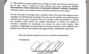 Paulo Marinho se disse decepcionado com o prefeito interino de Patos, razão pela qual não entregou a renúncia ao próprio gestor. O ex-secretário escreveu que não quer comungar com os posicionamentos políticos que interferem diretamente em questões de ordem técnica. Paulo também tornou público que nunca teve uma audiência com o interino e que este mesmo nunca atendeu uma ligação telefônica.