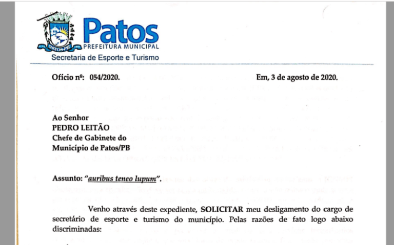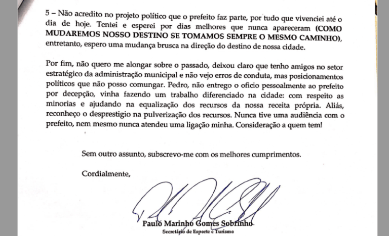 O secretário de Esportes e Turismo do Município de Patos, Paulo Marinho Gomes Sobrinho, entregou nesta segunda-feira, dia 03, carta de renúncia ao cargo através de ofício dirigido ao chefe de gabinete Pedro Leitão para ser repassado ao prefeito interino Ivanes Lacerda.